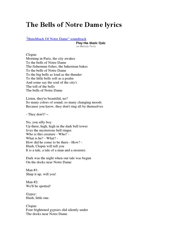Notre Dame Song Lyrics : The bells of notre dame. Notre Dame Song Lyrics : Rally sons of notre dame sing her glory and sound her fame raise her gold and blue and cheer with voices true: